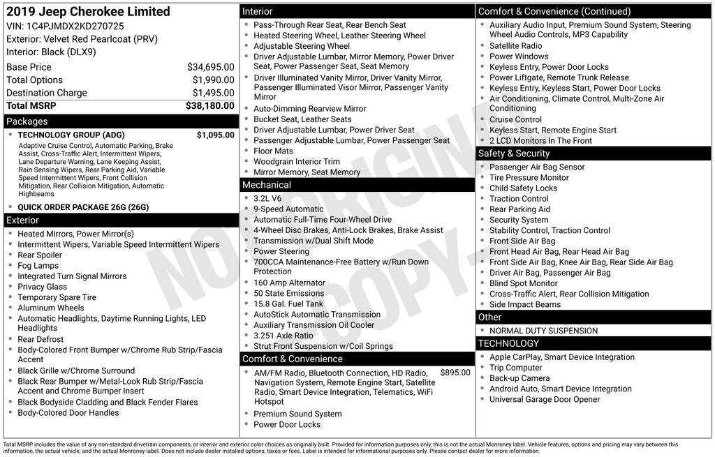 Discover the perfect blend of style, capability, and technology in this stunning 2019 Jeep Cherokee Limited. With its bold exterior design, spacious interior, and impressive performance, this SUV is ready to elevate your driving experience.